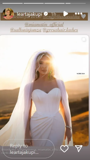 Engjëllusha, e njohur për stilin e saj unik dhe praninë magjepsëse, është shfaqur mahnitëse në fustanin e bardhë të nusërisë, një krijim i veçantë i punuar me detaje të imta që theksonin finesën dhe thjeshtësinë mbretërore.