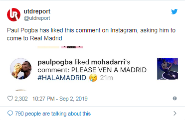 Paul Pogba i ka nxitur sërish spekulimet për të ardhmen e vet, pasi u kap duke e pëlqyer në koment që i kërkonte atij t’i bashkohet Real Madridit, në rrjetet sociale, në ditën e fundit të afatit kalimtar të verës.