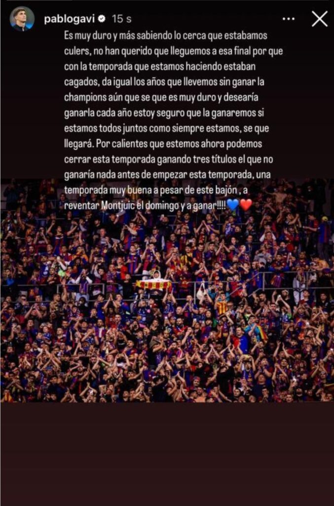 “Është vërtet e vështirë, veçanërisht duke ditur sa afër ishim. Ata nuk donin që ne të arrinim në finale sepse kishin frikë nga sezoni që po zhvillojmë”, shkroi Gavi në profilin e tij në Instagram.