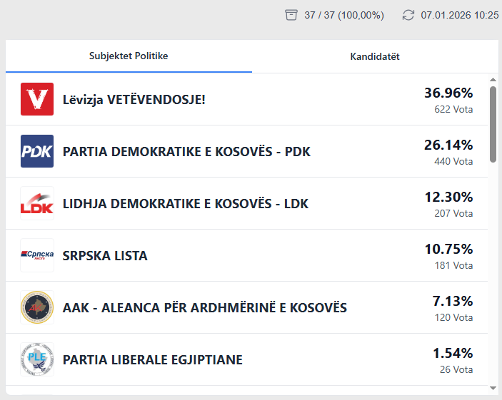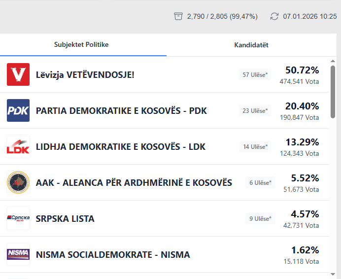 Me numërimin e këtyre votave, në rezultatet e përmbledhura VV ka 50.72%, PDK 20.40%, LDK 13.29^ dhe AAK 5.52%.