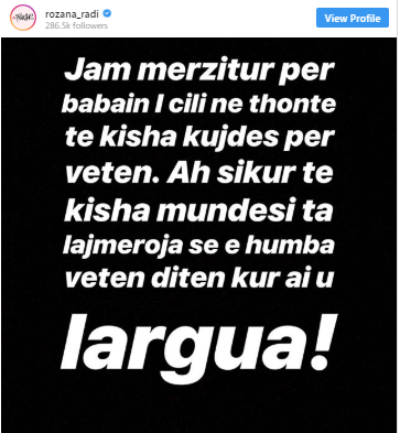 Me anë të këtij postimi, Rozi ka shperhur mallin e madh që e ka për babain. “Ah sikur të kisha mundësi të lajmjroja se e humba veten ditën kur ai u largua“, janë disa prej fjalëve që artistja i ka shkruar në Instagram. “Kur përfundon një dashuri si kjo e jona”, titullohet kënga e fundit e Rozana Radit .