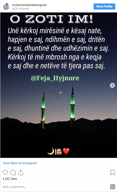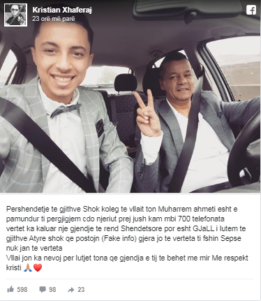 “Pershendetje te gjithve Shok koleg te vllait ton Muharrem ahmeti esht e pamundur ti pergjigjem cdo njeriut prej jush kam mbi 700 telefonata. Vertete ka kaluar nje gjendje te rend Shendetsore por esht GJaLL i lutem te gjithve Atyre shok qe postojn gjera jo te verteta ti fshin Sepse nuk jan te verteta. Vllai jon ka nevoj per lutjet tona qe gjendja e tij te behet me mir Me respekt Kristi.”, shkroi Xhaferaj.