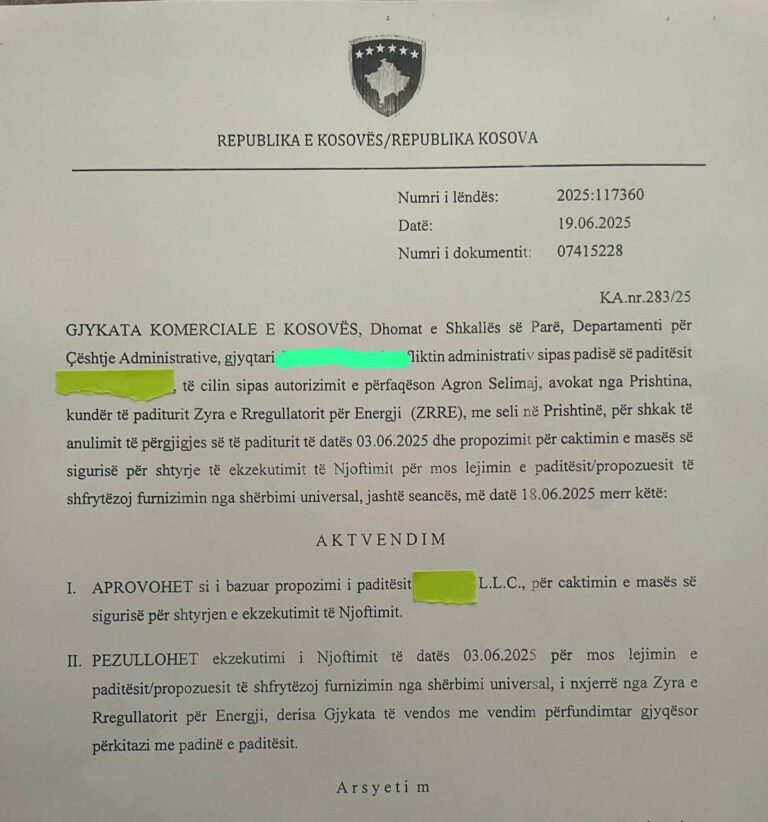 Gjykata Komerciale e Kosovës, Dhomat e Shkallës së Parë, Departamenti për Çështje Administrative, gjyqtari… sipas padisë së paditësit….të cilin sipas autorizimit e përfaqëson Agron Selimaj, avokat nga Prishtina, kundër të paditurit Zyra e Rregullatorit për Energji (ZRRE), me seli në Prishtinë, për shkak të anulimit të përgjigjes së të paditurit të datës 03.06.2025 dhe propozimit për caktimin e masës së sigurisë për shtyrje të ekzekutimit të njoftimit për moslejimin e paditësit/propozuesit të shfrytëzojë furnizimin nga shërbimi universal, jashtë seancës, më datë 18.06.2025 merr këtë:
