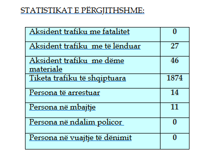 Sipas raportit të policisë, gjatë 24 orëve të fundit janë evidentuar disa aksidente në trafikun rrugor, 27 aksidente kanë qenë me lëndime dhe 46 me dëme materiale.
