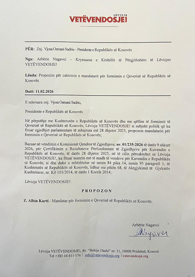 Letra është dërguar nga Arbërie Nagavci si Kryesuese e Këshillit të Përgjithshëm të VV-së.