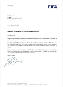 Presidenti i FIFA-s, Gianni Infantino e ka uruar Agim Ademin për rizgjedhjen e tij në krye të Federatës së Futbollit të Kosovës. Në letrën e tij, ai ka riafirmuar mbështetjen për zhvillimin e futbollit kosovar.