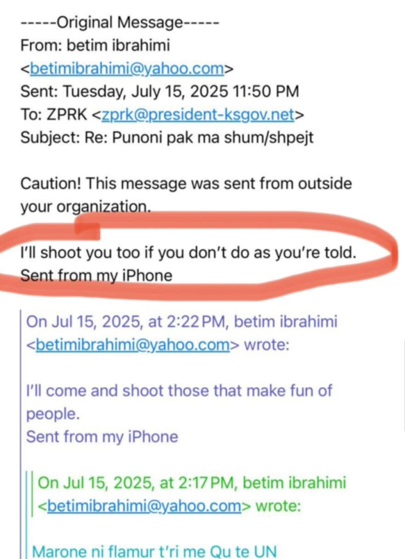 Mesazhi është shoqëruar edhe me një paralajmërim automatik të sistemit informativ të presidencës që e cilëson emailin si të ardhur nga jashtë organizatës.