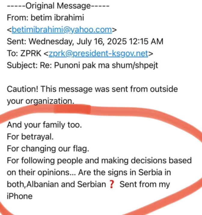 “”Edhe familja jote. Për tradhti. Për ndërrimin e flamurit tonë. Për ndjekjen e njerëzve dhe marrjen e vendimeve bazuar në mendimet e tyre… A janë shenjat në Serbi në të dyja gjuhët, shqip dhe serbisht?”,”, shkruhet ndër të tjera në emailin e dërguar më 16 korrik në ora 00:15.