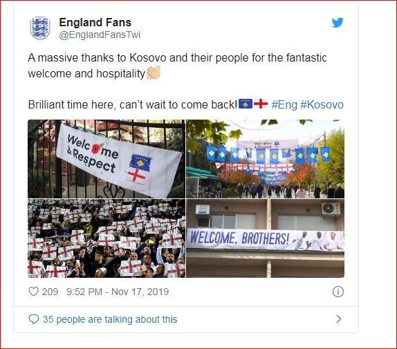Tifozët e Anglisë kanë falënderuar Kosovën për pritjen që iu bë në kuadër të ndeshjes për kualifikimet në Euro 2020.