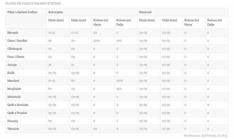 Qendra Kombëtare për Menaxhim Kufitar ka përditësuar të dhënat, duke bërë të ditur se pritjet për të hyrë në Kosovë përmes pikës kufitare të Dheut të Bardhë arrijnë deri në 1 orë e 30 minuta.