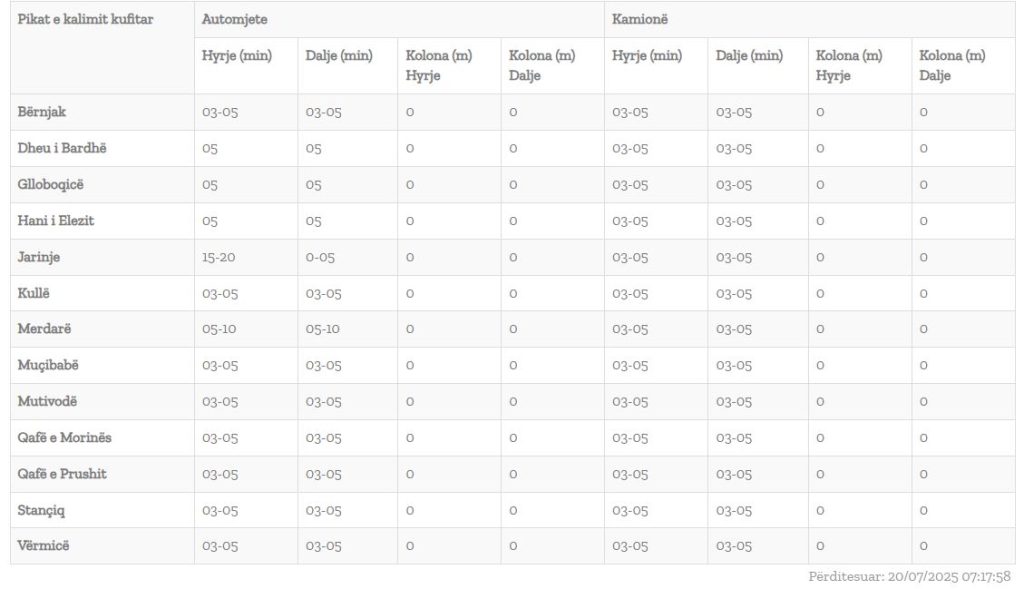 Kjo bazuar në përditësimin e fundit të bërë nga kjo qendër, pritjet nuk zgjasin mbi 5 minutam përveç se në Jarinjë ku për të hyrë në Kosovë pritjet shkojnë deri në 20 minuta.
