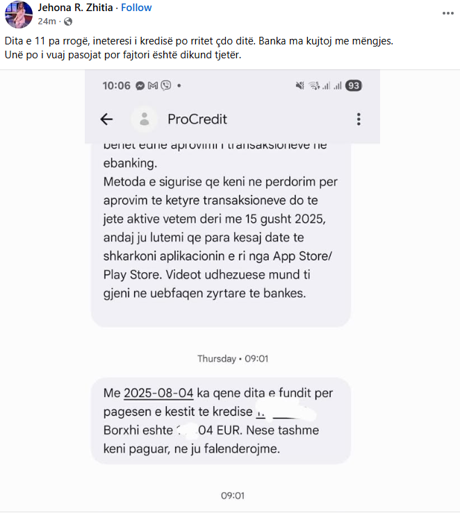 “Dita e 11 pa rrogë, ineteresi i kredisë po rritet çdo ditë. Banka ma kujtoj me mëngjes. Unë po i vuaj pasojat por fajtori është dikund tjetër”, ka shkruar ajo.
