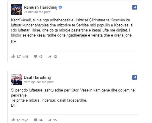 “Kadri Veseli, si një nga udhëheqësit e Ushtrisë Çlirimtare të Kosovës ka luftuar kundër shtypjes dhe mizorive të Serbisë mbi popullin e Kosovës, si çdo luftëtar i lirisë, dhe do ta mbrojë pastërtinë e kësaj lufte me dinjitet”, theksoi Haradinaj.