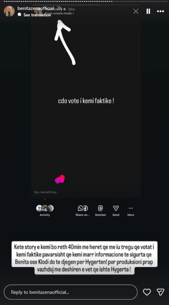 Mirëpo, pasi në finale u shpall Hygerta Sako ndërsa Benita mbeti jashtë garës, reagimi u ashpërsua. Në një tjetër story u publikua deklarata: “Këtë story e kemi bërë rreth 40 minuta më herët që me iu tregu që votat i kemi faktike pavarësisht që kemi marr informacione të sigurta që Benita ose Klodi do të djegën për Hygertën! Por produksioni prapë vazhdojmë me dëshirën e vet që ishte Hygerta”, një mesazh që u interpretua si akuzë për manipulim rezultatesh.