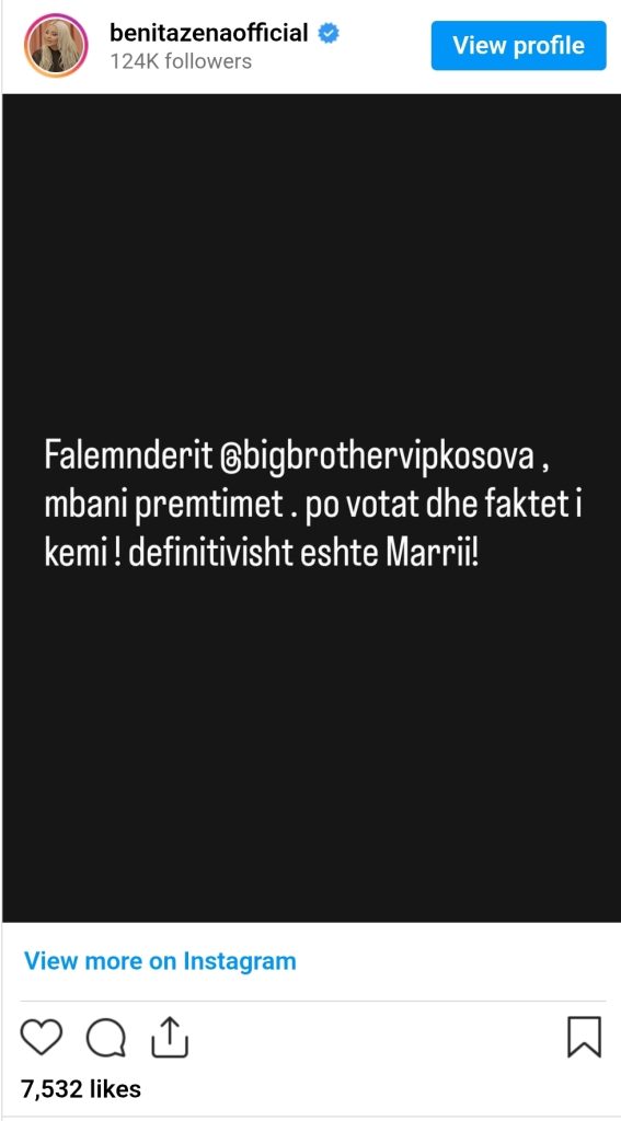 Fillimisht, pak para se të shpalleshin finalistët, në InstaStory u publikua një mesazh ku shkruhej: “Çdo votë e kemi faktike”, duke lënë të kuptohej se ata kishin bindjen se mbështetja e publikut ishte në anën e Benitës.