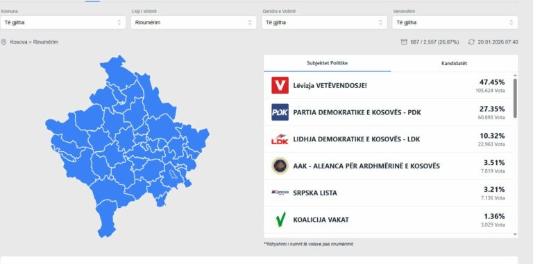 Nga përditësimi i fundit i KQZ-së, LVV del t’i ketë marrë 47.45% të votave, PDK 27.35%, LDK 10.32% dhe AAK 3.51%.