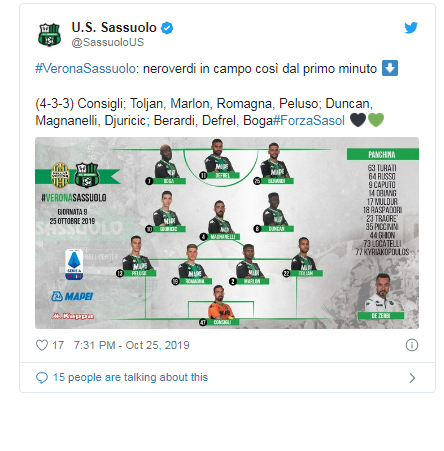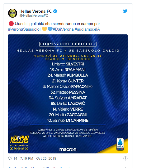 Janë publikuar formacionet zyrtare për ndeshjen Hellas Verona – Sassuolo.