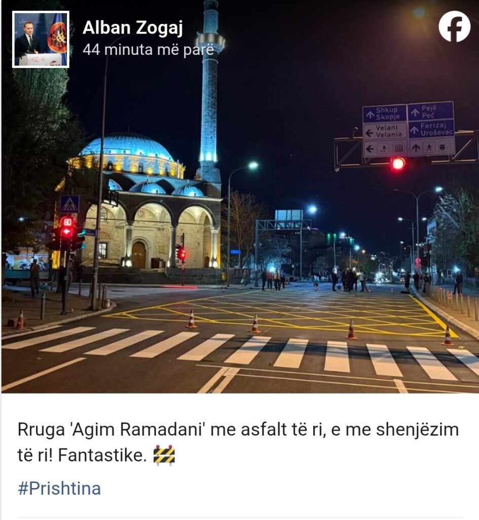 “Rruga ‘Agim Ramadani’ me asfalt të ri, e me shenjëzim të ri! Fantastike. 🚧”, ka shkruar Zogaj në Facebook.