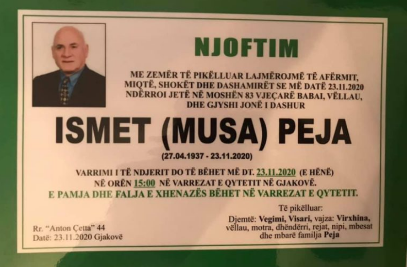 Ka ndërruar jetë këngëtari i mirënjohur kosovar, Ismet Peja. Sot ndërroi jetë ikona e muzikës shqipe, Ismet Peja. Doajeni i muzikës shqipe, Ismet Peja, ka ndërruar jetë në ...
