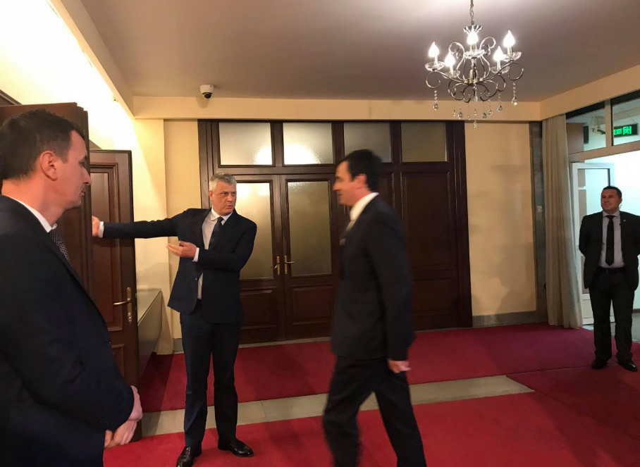Ashtu siç u paralajmërua, ka nisur takimi mes presidentit të vendit, Hashim Thaçi me kryeministrin e Kosovës, Albin Kurti. Kurti e Thaçi në...