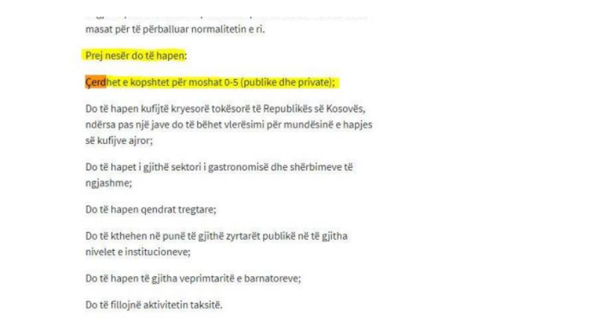Qeveria në detyrë sot ka marrë vendim që nga nesër t’i rihapë çerdhet. Gjatë ditës së sotme Qeveria në detyrë e Kosovës në mbledhjen e mbajtur ndër të tjerash ka marrë vendim ...