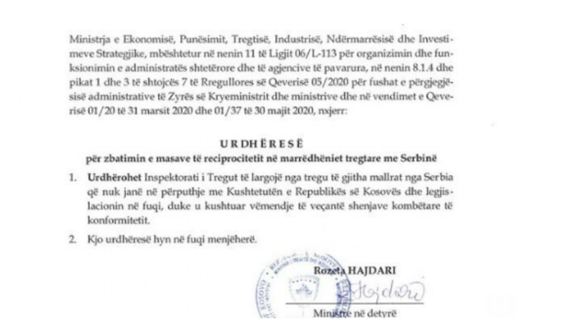Mallrat serbe që nuk janë në përputhje me Kushtetutën e Kosovës do të largohen nga tregu. Ministrja në detyrë e Ekonomisë, Rozeta Hajdari, ...