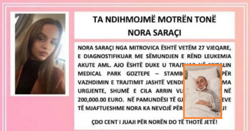 Nora Saraçi ka nevojë për ndihmë. Është bërë një thirrje për ti dal në ndihmë 27 vjeçarës nga Komuna e Mitrovicës, Nora Saraçi e cila është diagnostikuar me sëmundjen e rëndë...