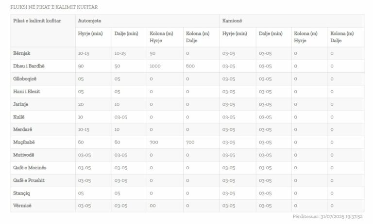 Qendra Kombëtare për Menaxhim Kufitar ka përditësuar të dhënat, duke bërë të ditur kështu se në pikën kufitare të Dheut të Bardhë po pritet deri në 1 orë e 30 minuta për të hyrë në Kosovë.