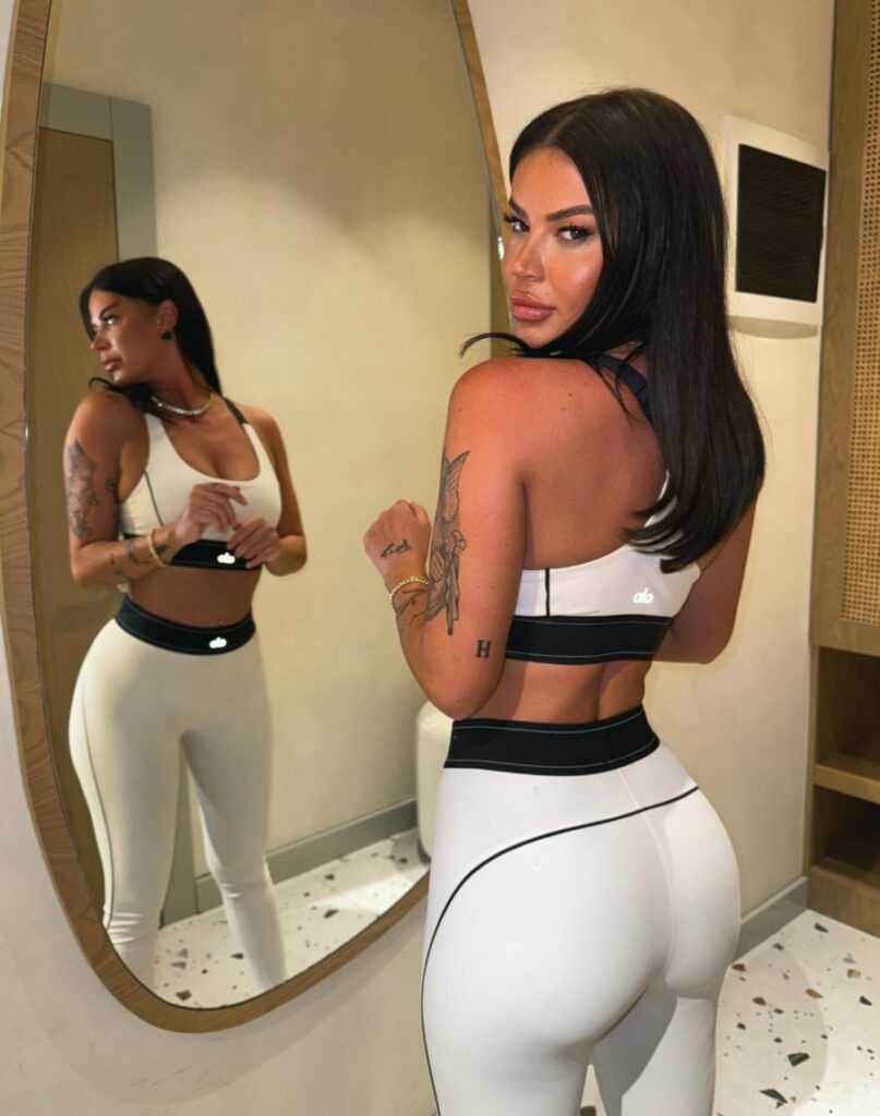 Në këtë foto, ajo shfaqet e veshur me një komplet sportive të bardhë, që thekson formatohet e saj trupore dhe stilin e saj të veçantë. Vëmendja e saj ndaj detajeve dhe zgjedhja e veshjeve përputhen perfekt me linjat e saj, duke e bërë atë një ikone të stilit për shumë adhurues.