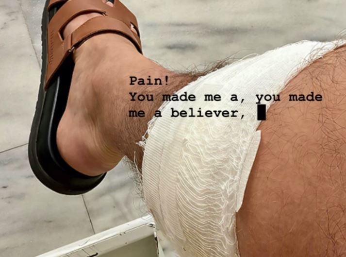 Ai shfaqet i ulur, me një fashë të madhe në këmbën e djathtë, një tregues i qartë se bëhet fjalë për një procedurë kirurgjikale që, ndonëse nuk zbulohet me detaje nga vetë artisti, duket se ka qenë serioze sa i përket kujdesit mjekësor të nevojshëm.