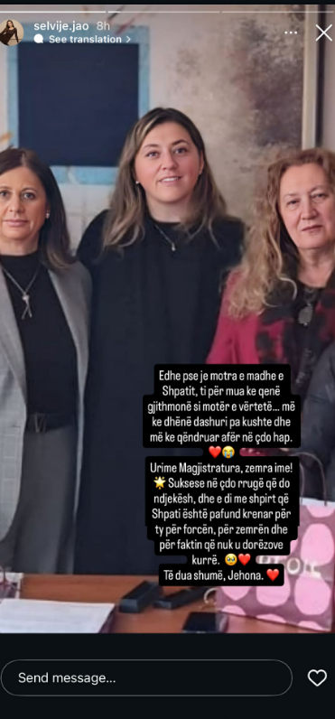 “Urime Magjistratura, zemra ime. Suksese në çdo rrugë që do ndjekësh. E di që Shpati sot buzëqesh për ty. Të dua shumë, Jehona,” përfundon urimi i Selvijes.
