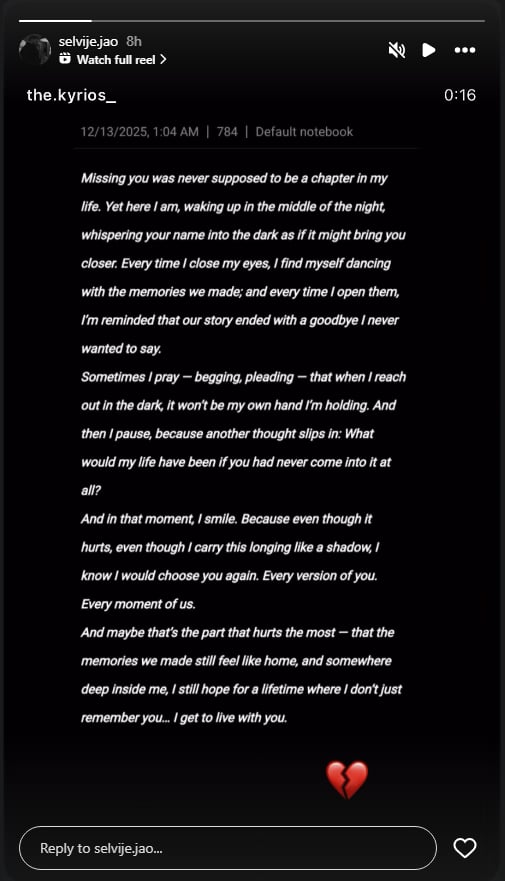 Në postimin e saj, Selvija përshkruan netët e gjata dhe të heshtura, ku zgjohet papritur në mes të errësirës, duke pëshpëritur emrin e tij, sikur ky veprim i thjeshtë të kishte fuqinë ta sillte më pranë.