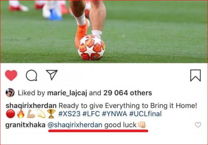 Shaqiri në rrjete sociale ka publikuar fotografi nga stërvitja e fundit, ndërsa lojtari tjetër shqiptar, Granit Xhaka i komentoi duke i uruar fat.