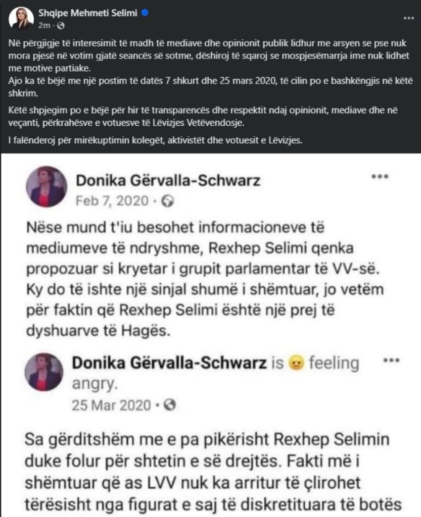 “Në përgjigje të interesimit të madh të mediave dhe opinionit publik lidhur me arsyen se pse nuk mora pjesë në votim gjatë seancës së sotme, dëshiroj të sqaroj se mospjesëmarrja ime nuk lidhet me motive partiake. Ajo ka të bëjë me një postim të datës 7 shkurt dhe 25 mars 2020, të cilin po e bashkëngjis në këtë shkrim”.