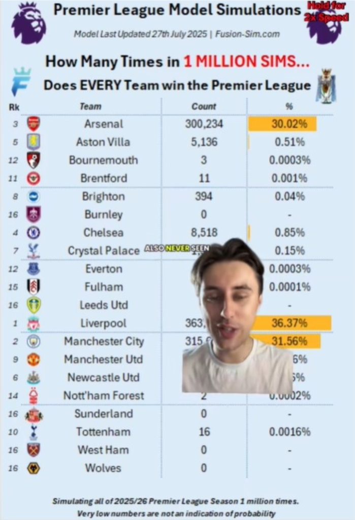 Ndërkohë, faqja e të dhënave të futbollit, Fusion Sim, ka kryer një eksperiment për të parë se sa herë secila skuadër e Ligës Premier do ta fitonte titullin pas një milion simulimesh.