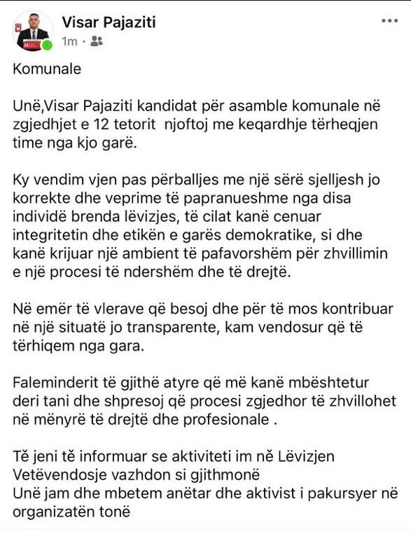 Visar Pajziti, ka bërë të ditur se, pavarësisht tërheqjes nga kandidimi, aktiviteti i tij në Lëvizjen Vetëvendosje do të vazhdojë, duke mbetur anëtar dhe aktivist i përkushtuar i organizatës.
