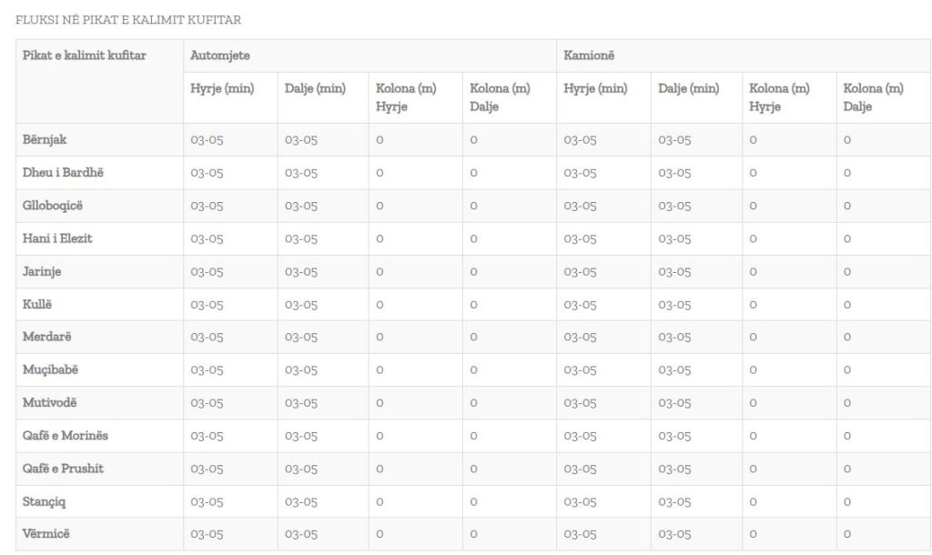 Sipas të dhënave të përditësuara rreth orës 07:02, koha për të hyrë në Kosovë dhe për të dalë nga Kosova, në të gjitha pikat kufitare sillet rreth 3 e deri në 5 minuta.