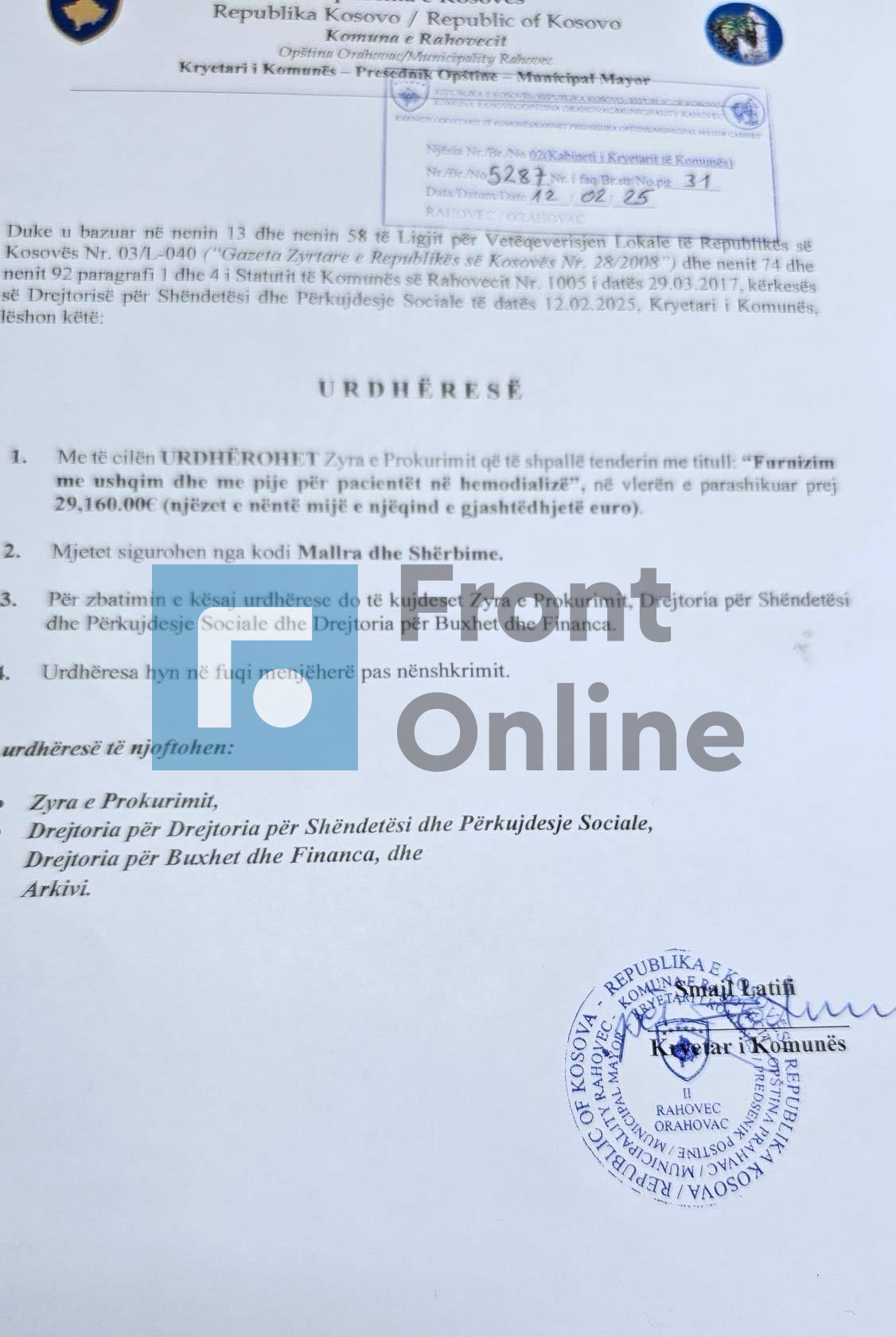 Komuna e Rahovecit e cila drejtohet nga Smajl Latifi përmes një vendimi ka anuluar tenderin për furnizim me ushqim për pacientet e Hemodializës që gjenden në këtë qytetet, deri sa të nijetit me ushqim i ka furnizuar pa kontratë nga një Qebaptore që operon në këtë komunë, raporton Front Online.