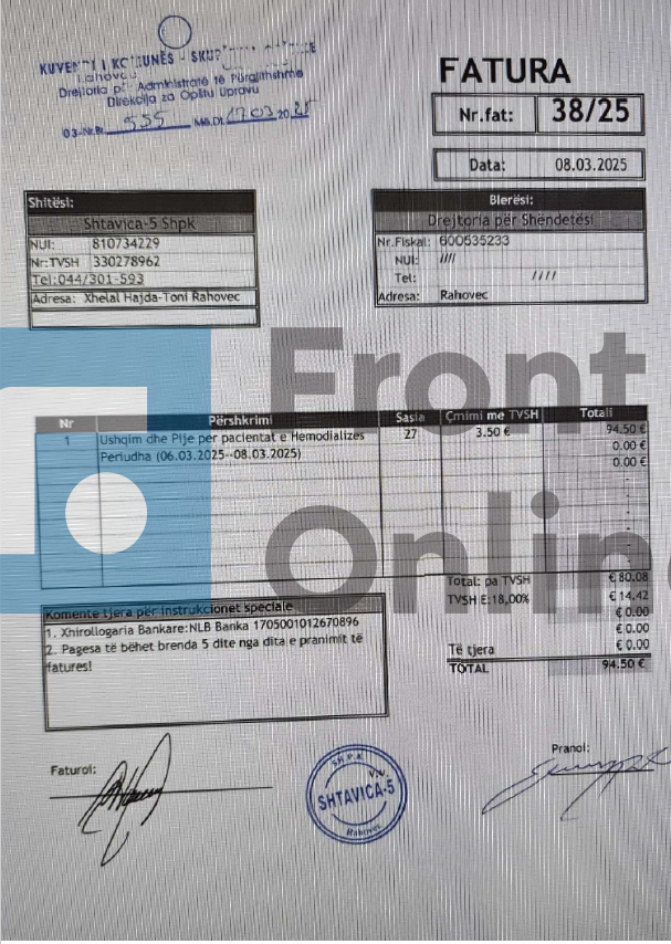 Sipas faturës shihet se kjo e fundit ka furnizuar me ushqim 27 paciente të Hemodializës me çmim prej 3.5 euro për person.