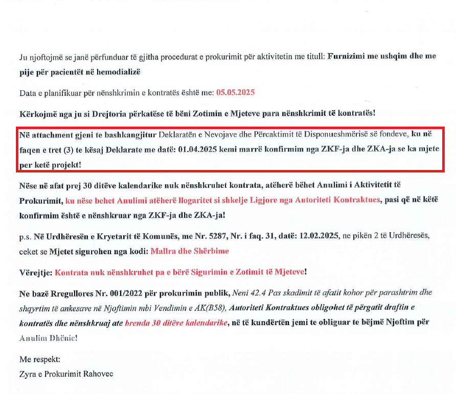 “Andaj nuk mund te bëjmë kontrata pa sigurim te mjeteve financiare” thuhet në arsyetim.