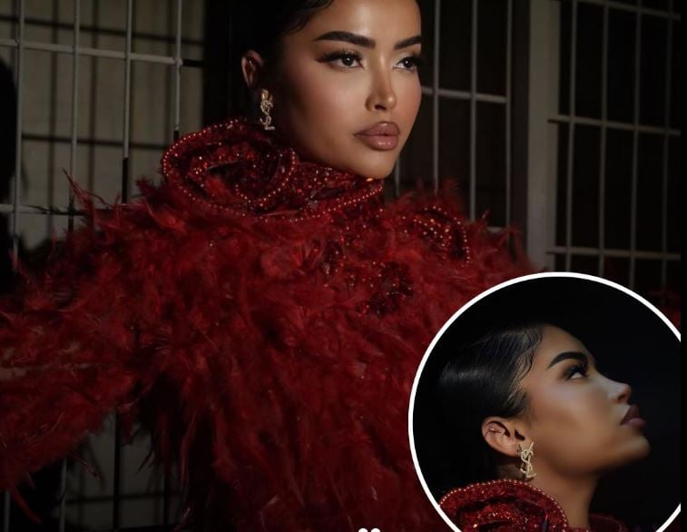 Ajo ka zgjedhur të vishet me një fustan të kuq me pupla, i cili i jep një pamje tejet “glamur” dhe elegante, duke reflektuar vetëbesim, pjekuri dhe hijeshi.