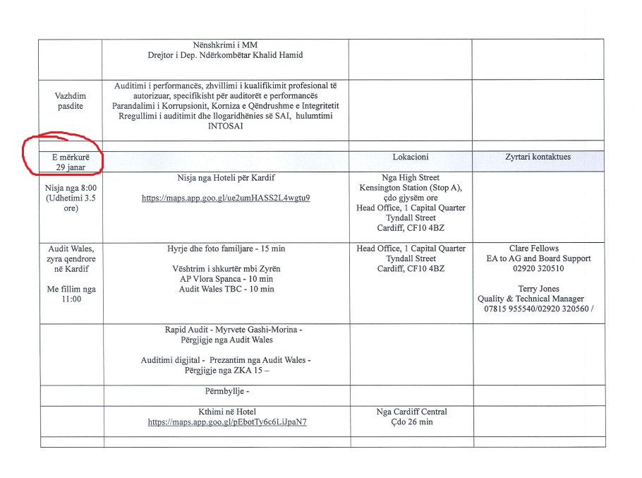 Për dy vjet, krerët e ZKA-së morën mbi 12 mijë euro mëditje, ndërsa një vizitë në Angli ngre dyshime për pagesa përtej agjendës zyrtare. Kjo pasi, stafi ishte kthye nga udhëtimi zyrtar në Angli sapo përfundoi agjenda. Auditorja, ndërkohë, qëndroi më shumë jashtë vizitës zyrtare, duke përfituar mëditje shtesë, shkruan Demokracia.com.