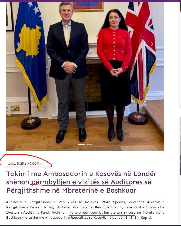 Sipas njoftimeve publike të vetë ZKA-së, delegacioni i institucionit ka përfunduar vizitën zyrtare në Mbretërinë e Bashkuar më 31 janar 2025, datë kur në faqen zyrtare është publikuar njoftimi se “takimi me Ambasadorin e Kosovës në Londër shënon përmbylljen e vizitës së Auditores së Përgjithshme në Mbretërinë e Bashkuar”.