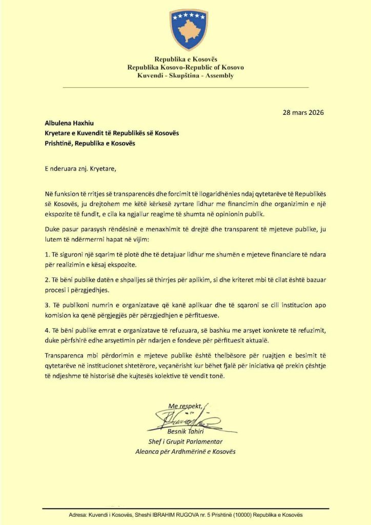 Shefi i Grupit Parlamentar të Aleancës për Ardhmërinë e Kosovës, Besnik Tahiri, i është drejtuar me një kërkesë zyrtare kryetares së Kuvendit të Kosovës, Albulena Haxhiu, duke kërkuar sqarime të detajuara lidhur me financimin dhe organizimin e ekspozitës me të dhëna të pasakta mbi luftën në Kosovë.