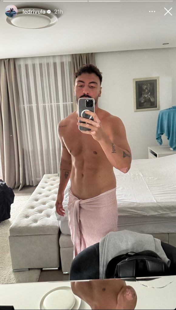 Pak minuta më vonë, Ledri postoi një tjetër foto në Instagram Story – këtë herë i fotografuar nga mbrapa, gjysmë i zhveshur, në një dhomë hoteli.