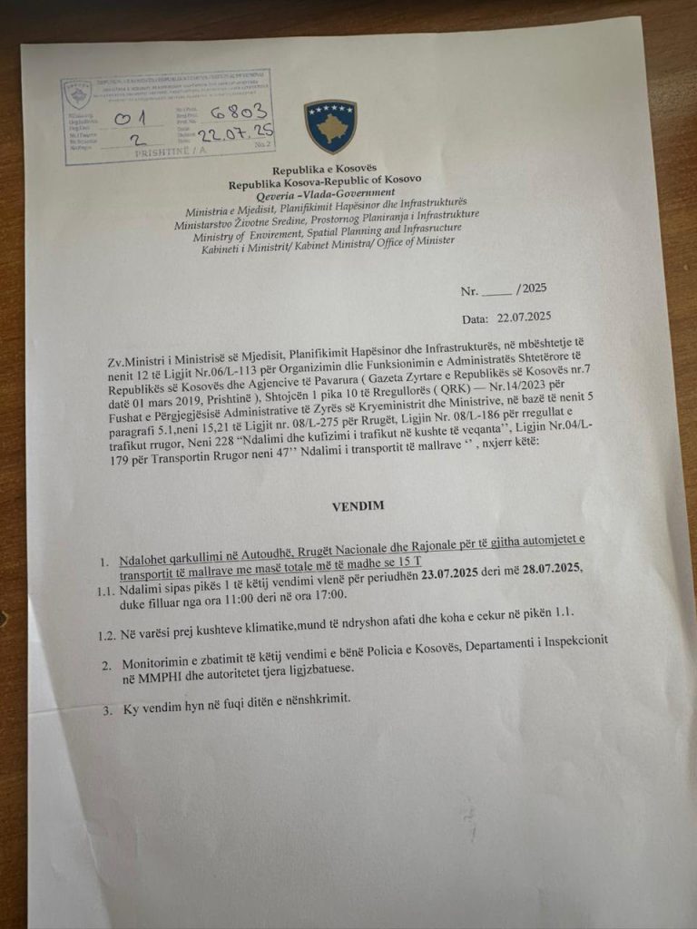 “Të dashur qytetarë, Për shkak të temperaturave të larta që po mbretërojnë këto ditë kemi marrë vendim për ndalimin e qarkullimit të automjeteve me peshë mbi 15 T, në autoudhë, rrugë nacionale dhe rajonale.