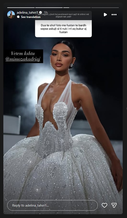 Adelina u mjaftua të thoshte “Vetëm kështu”, duke shoqëruar përgjigjen me një imazh të një modeleje që mbante një fustan të bardhë, ndërsa ajo vetë nuk u shfaq në foto.