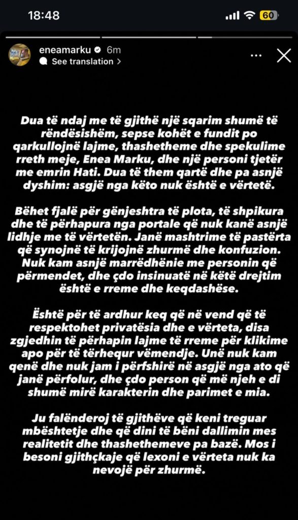 “Dua të ndaj me të gjithë një sqarim shumë të rëndësishëm, sepse kohët e fundit po qarkullojnë lajme, thashetheme dhe spekulime rreth meje, Enea Marku, dhe një personi tjetër me emrin Hati. Dua të them qartë dhe pa asnjë dyshim: asgjë nga këto nuk është e vërtetë,” shkruan ai.