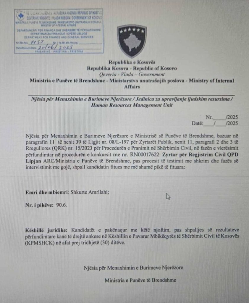 Në konkursin e shpallur me numrin e referencës RN00017622, për pozitën Zyrtare për Regjistrim Civil në Qendrën për Regjistrim Civil në Lipjan, ka dalë fituese Shkurte Amrllahi, e cila ka marrë gjithsej 90.6 pikë pas testimit me shkrim dhe me gojë.