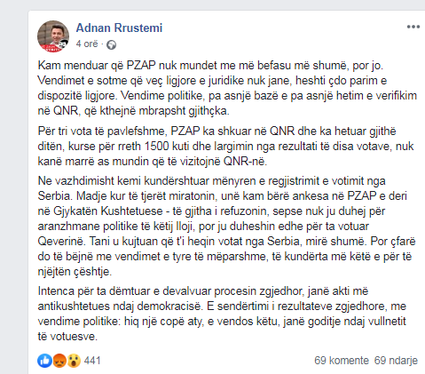 “Për tri vota të pavlefshme, PZAP ka shkuar në QNR dhe ka hetuar gjithë ditën, kurse për rreth 1500 kuti dhe largimin nga rezultati të disa votave, nuk kanë marrë as mundin që të vizitojnë QNR-në. Ne vazhdimisht kemi kundërshtuar mënyren e regjistrimit e votimit nga Serbia. Madje kur të tjerët miratonin, unë kam bërë ankesa në PZAP e deri në Gjykatën Kushtetuese – të gjitha i refuzonin, sepse nuk ju duhej për aranzhmane politike të këtij lloji, por ju duheshin edhe për ta votuar Qeverinë. Tani u kujtuan që t’i heqin votat nga Serbia, mirë shumë. Por çfarë do të bëjnë me vendimet e tyre të mëparshme, të kundërta më këtë e për të njëjtën çështje”, shton ai.